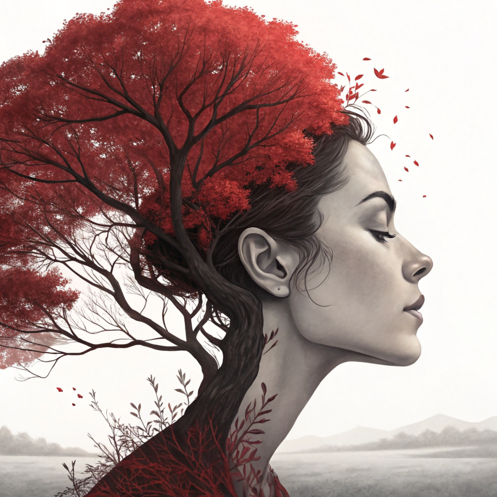 THE ROOTED SPIRIT OF A WOMAN AND A TREE WITH VIBRANT RED FOLIAGE