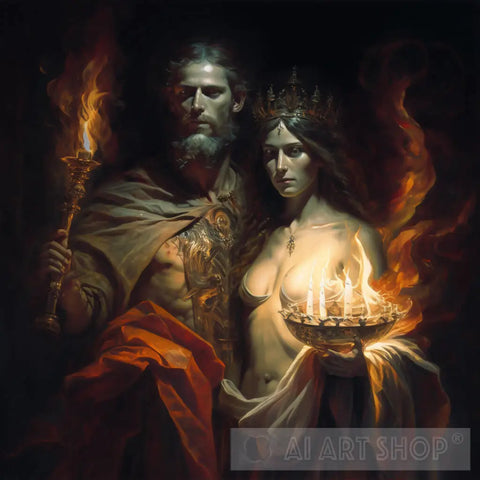 The AI-generated oil painting depicts Hades and Persephone amidst swirling smoke and fire on a black background. Hades wields a torch while Persephone holds a chalice with lit candles, creating a dramatic and intense scene.