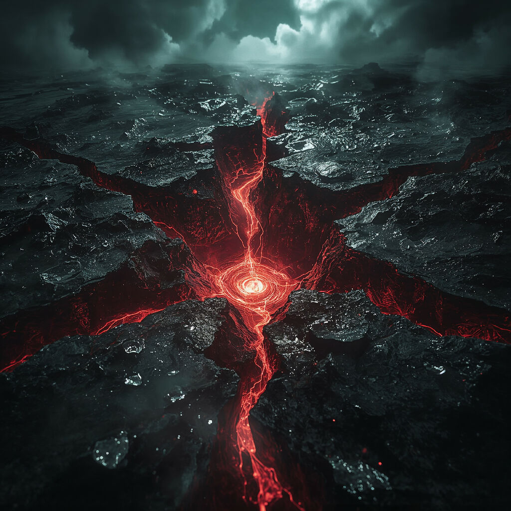 Fractured earth reveals molten arteries of light streaming toward a central vortex of energy. The composition suggests both geological violence and spiritual breakthrough, a wound in reality through which divine essence flows. Dark, weathered stone creates a harsh surface narrative, while the brilliant red-orange energy beneath speaks to hidden vitality and transformation. The circular formation at the composition's heart evokes both crater and mandala, destruction and sacred geometry unified. Light streams upward like prayer or revelation, connecting terrestrial rupture with celestial mystery. The work explores themes of necessary destruction, suggesting that enlightenment requires the breaking open of established forms to reveal the luminous truth within.