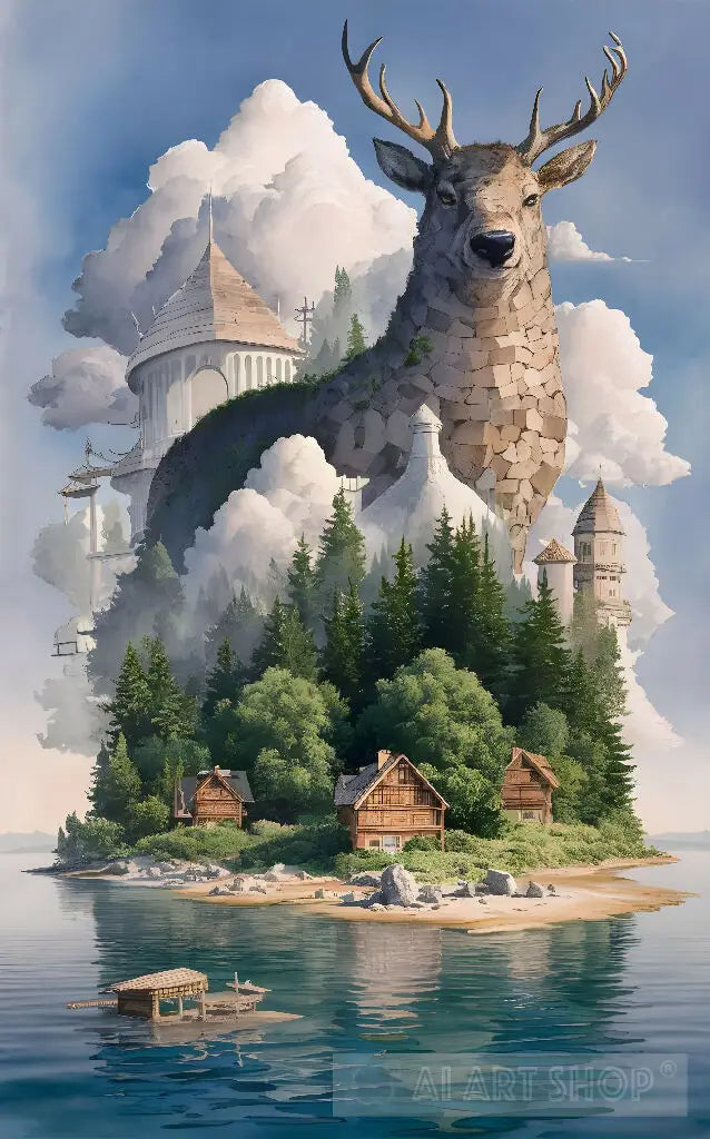 The scene presents a serene, surrealist shoreline adorned with a colossal stone deer-shaped mountain, casting an imposing presence above a lush forest and wooden houses.