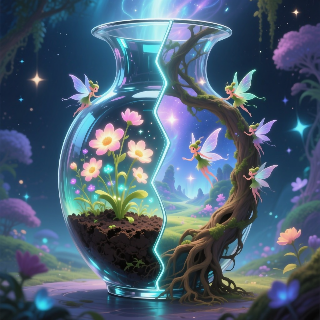 A vase unlike any other — one half nurtures luminous flowers rooted in soil, while the other half reveals a magical fairy realm. This enchanting still life bridges futuristic design with childhood wonder, glowing with Disney-like fantasy. A beautiful choice for art lovers who want whimsy and modernity in a single frame.