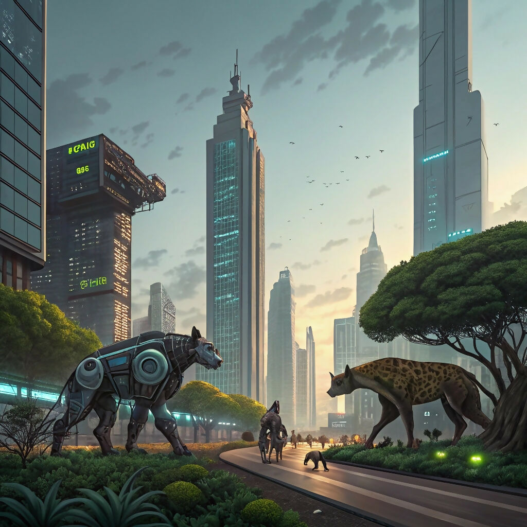 A profoundly unique and thought-provoking digital artwork that masterfully blends the natural world with a futuristic one. This piece captivates with a surreal scene where an anthropomorphic bear and a sleek robot, both engrossed in their devices, stand in a serene natural setting alongside a towering giraffe. In the background, modern air vehicles and buildings hint at a highly advanced, yet visually striking, society. This is an exclusive, high-concept piece designed to be a conversation starter and a valuable addition to a curated art collection.