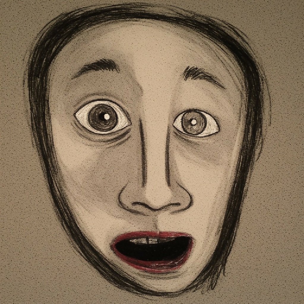 Their eyes are wide open, with pupils dilated, conveying a sense of disbelief or astonishment. The eyebrows are dramatically raised, further emphasizing the startled expression.