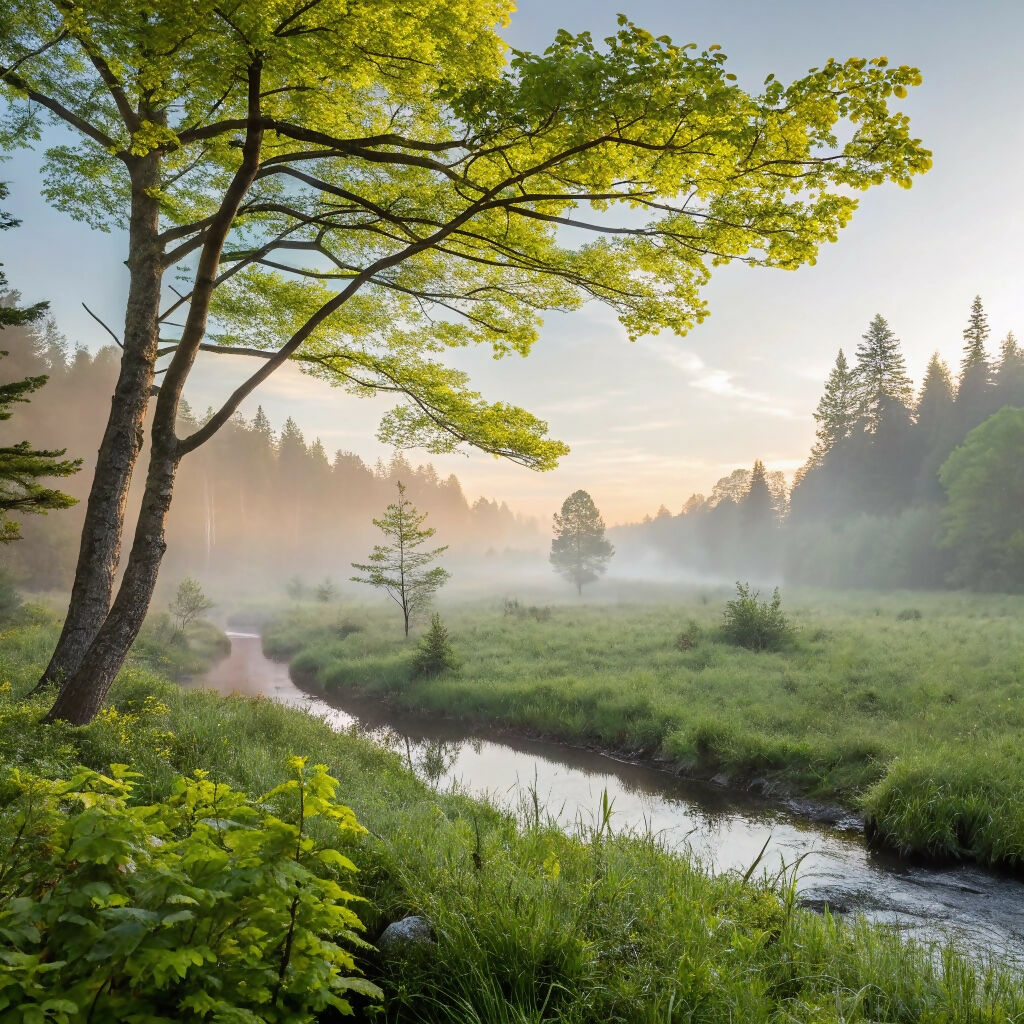 A serene landscape at dawn or dusk. A winding stream flows through a grassy meadow, which is blanketed in a light mist. The meadow is bordered by a line of evergreens and deciduous trees. A large deciduous tree with a broad, light green canopy hangs over the stream, its branches reaching across to the opposite bank.