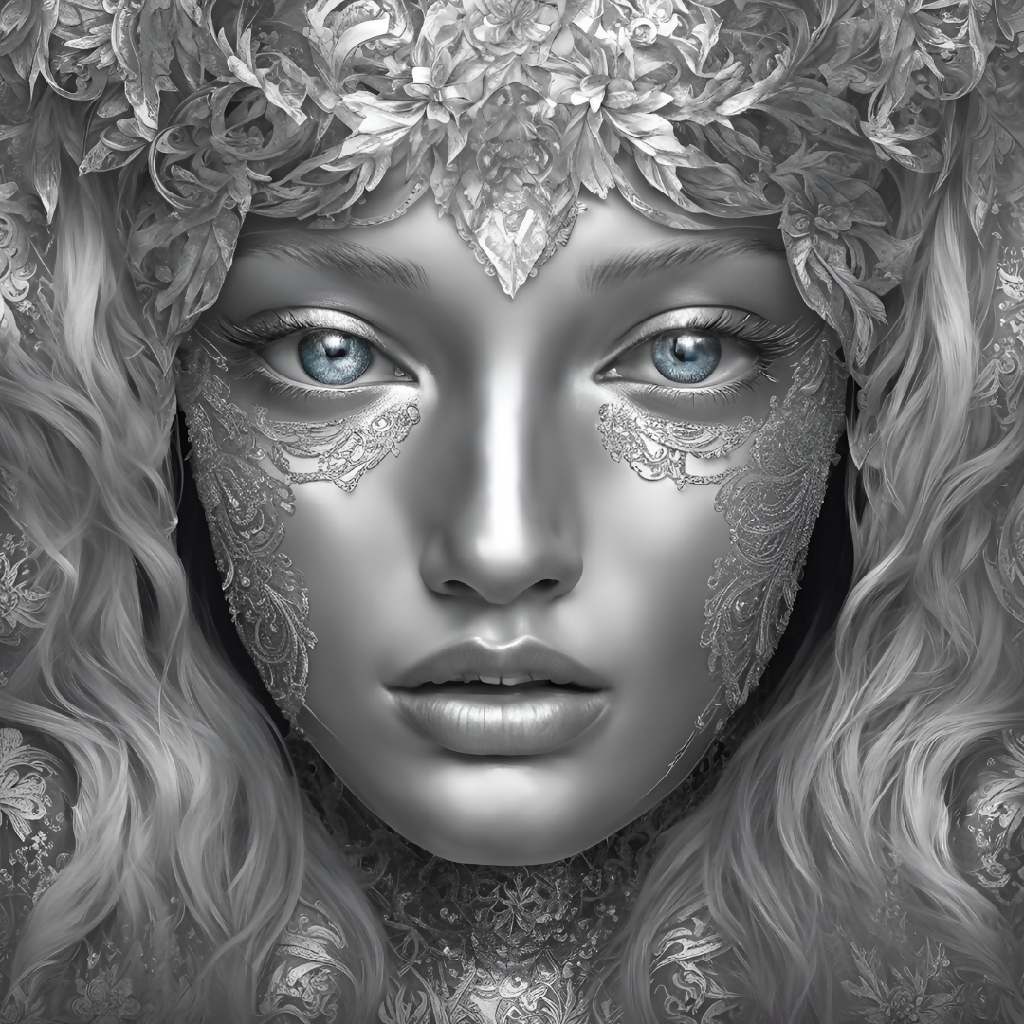 - Fantasy Realism: The highly detailed rendering of the face, hair, and metallic textures makes it look almost lifelike, but the surreal elements like the intricate silver lace and crown add a fantastical touch.