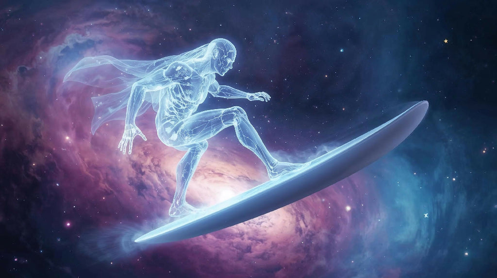 Vivid depiction of the comic book hero The Silver Surfer riding through space.
