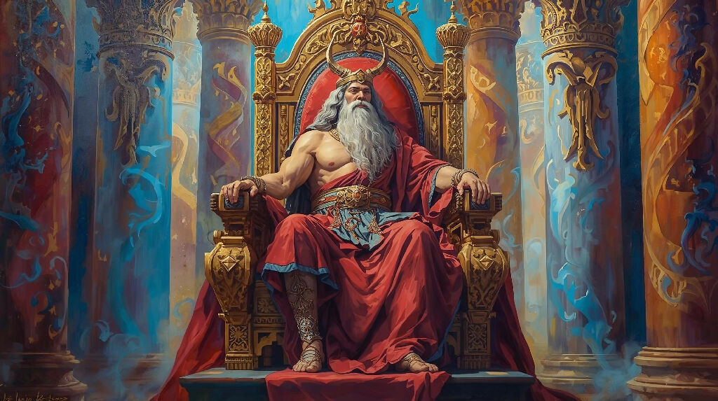 Vivid. brightly colored painting of the Norse god ruler sitting on his throne in Valhalla.