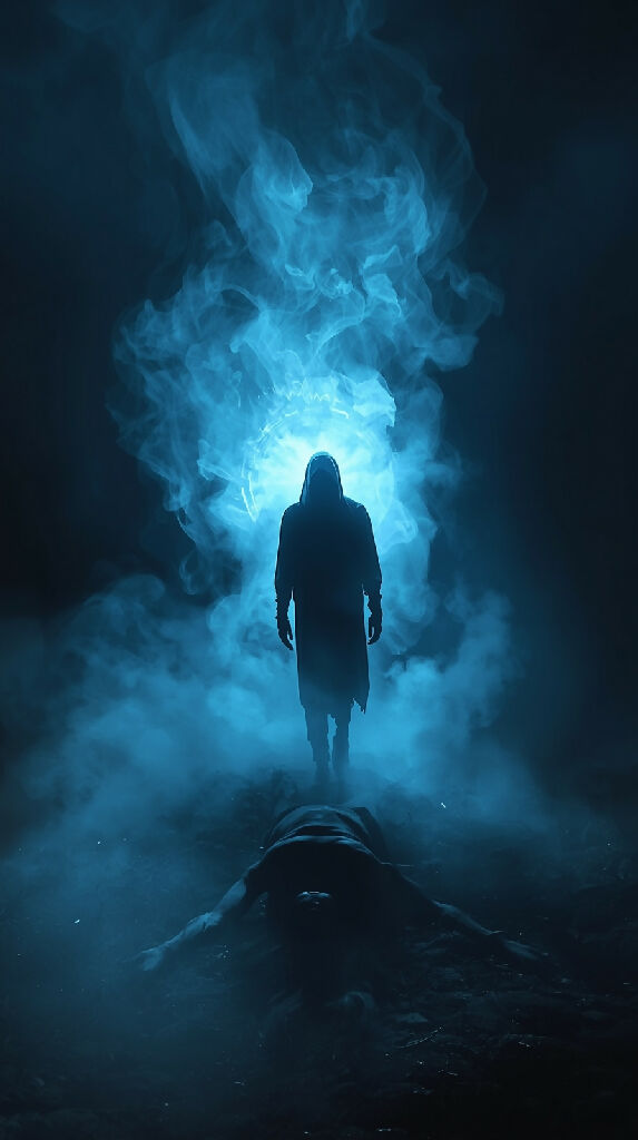 The soul entering a mysterious dark world, with a lifeless body lying still in the background, is poised at the threshold of a foggy Barzakh realm, where an eerie soft blue light casts an otherworldly glow, illuminating the dark silhouette of the soul as it steps forward into the unknown, with tendrils of mist swirling around its ethereal form, and an atmosphere of foreboding anticipation hanging in the air, as the soul embarks on a journey through the mystical realm, with the blue light dancing across the fog, creating an mesmerizing display of light and shadow.