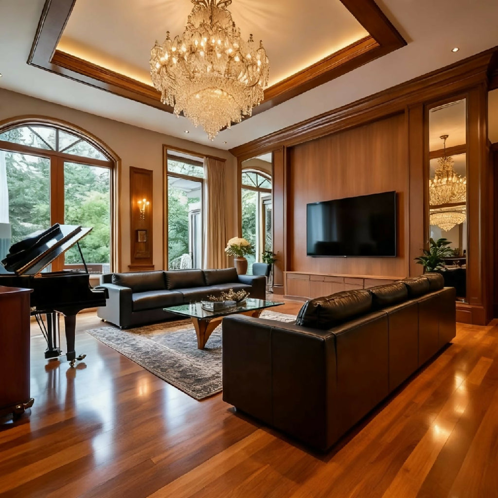 A magnificent portrait of uncompromised classical opulence and comfort. This exclusive artwork captures The Sovereign Salon, featuring the brilliant sparkle of a massive crystal chandelier, deep leather seating, and a grand piano, all set against rich wood paneling and vast windows. It is the ultimate acquisition for the connoisseur who commands timeless elegance, values luxurious, absolute privacy, and owns the vision of perfected, classical living.