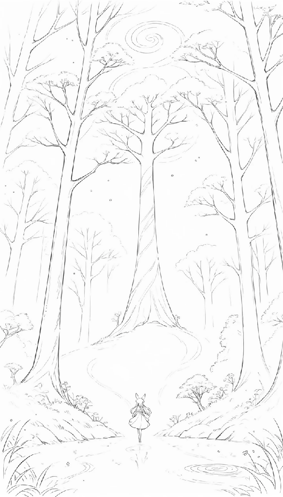 A fox-like wanderer steps into a forest of towering elegance, where slender trees stretch skyward and curve like whispered secrets. At the heart of the scene stands a majestic spiral-topped tree—an ancient sentinel pulsing with quiet magic. Pools of water glimmer in the foreground, reflecting the journey ahead, while the winding path draws the viewer deeper into the mystery. Sparse foliage and delicate linework evoke a dreamlike stillness, as if the forest itself is holding its breath. This monochrome fantasy invites exploration, wonder, and the timeless pull of the unknown.