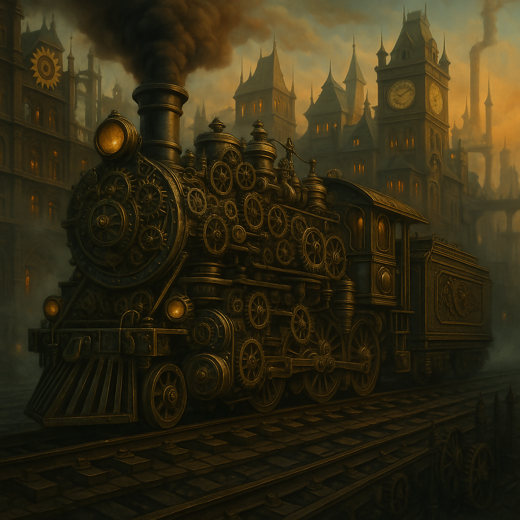 A steampunk locomotive rolling through a smoky Victorian town, complete with brass fittings, exposed gears, and billowing steam against a backdrop of clock towers and gear-driven architecture.