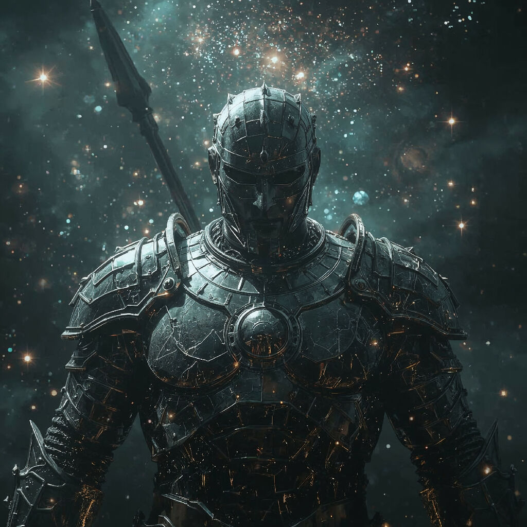 Weathered armor reflects cosmic light as a silent sentinel stands against infinity. Battle-scarred metal tells stories of countless conflicts while the star-filled void suggests eternal vigilance. The figure's imposing presence creates stability within celestial chaos, embodying duty transcending mortal existence. Mechanical precision meets organic purpose in this fusion of warrior and cosmic protector. The composition balances earthly warfare with universal guardianship, where physical strength serves metaphysical protection. Dark armor against luminous stars creates visual tension between shadow and light, mortality and eternity. This guardian represents humanity's capacity to find purpose through service to something greater than individual survival.
