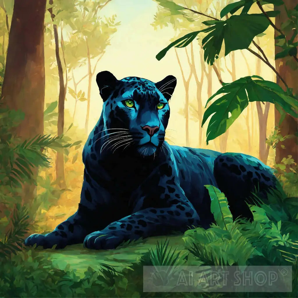 A black panther with green eyes sits on a tree trunk in the dense, lush Amazon rainforest. The vibrant greenery and the bright sunlight give the forest a serene and beautiful atmosphere.