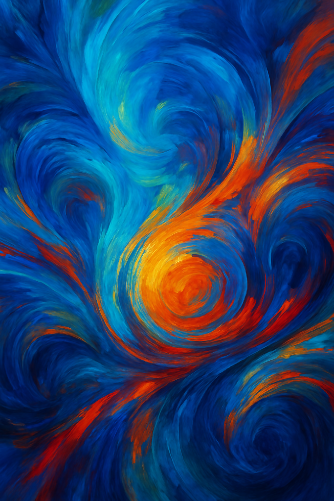 This artwork is a mesmerizing symphony of swirling motion and luminous color. Rich shades of deep oceanic blue and turquoise dominate the canvas, evoking the depth and energy of flowing water. From the center bursts a radiant core of orange and golden light, like fire igniting within a storm, its warmth bleeding outward into cooler tones. The brush strokes are bold, fluid, and dynamic, creating the sense of an endless vortex — a dance between calm and chaos, water and flame, serenity and power.