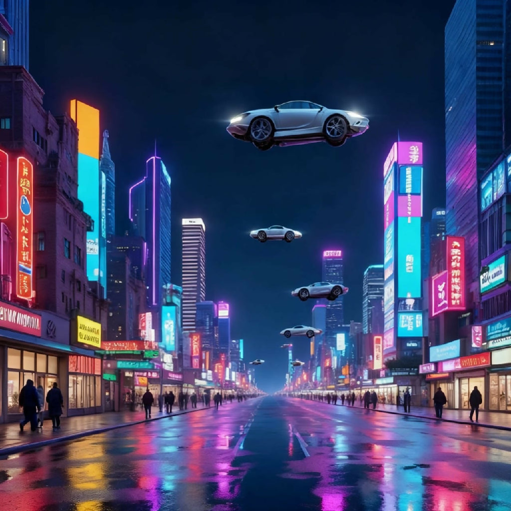 A dazzling portrait of future velocity. This exclusive artwork, "The Urban Ascent", captures a hyper-modern metropolis alive with neon reflections and high-performance flying luxury vehicles. It is a dynamic, high-energy statement piece for the collector who moves faster than the market.