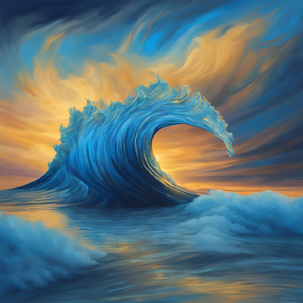 This piece is in a fantastical, semi-realistic, and impressionistic art style. It blends elements of surrealism and romanticism, with dramatic lighting, vivid colors, and fluid, painterly brushstrokes. The swirling movement of the wave and the expressive sky give it an almost dreamlike quality, reminiscent of modern digital painting with elements of classical impressionism.