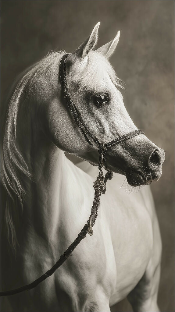 Step into an aura of pure elegance with this fine art photograph, capturing the legendary beauty of a white Arabian horse. Bathed in soft, painterly light, the portrait is presented in a sophisticated monochrome palette with warm sepia undertones.