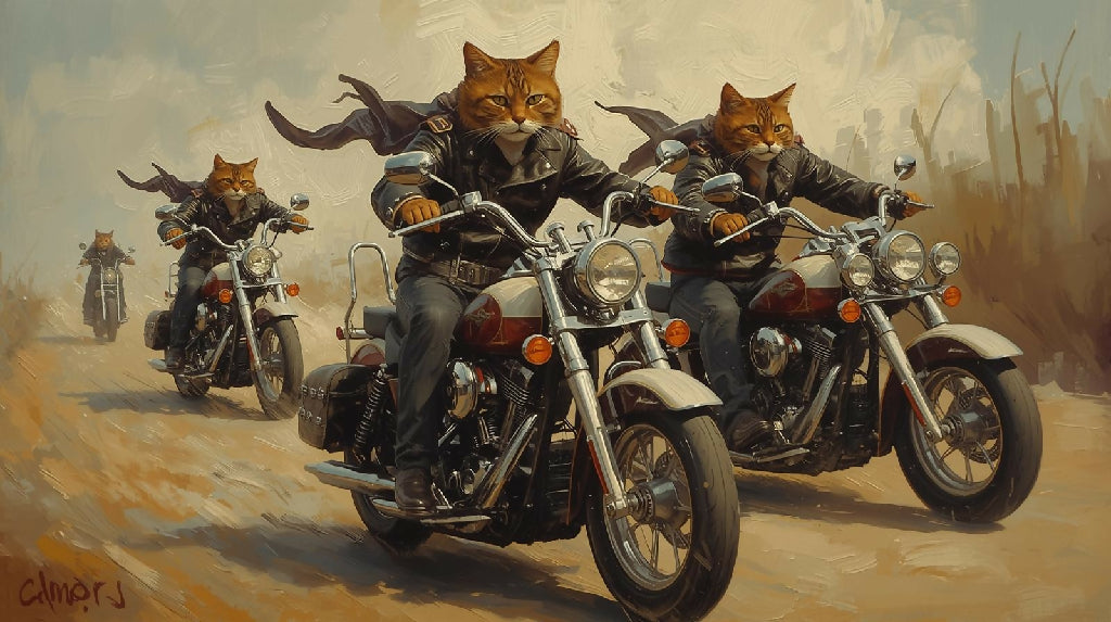 Parody painting of a feline biker gang on the open road.