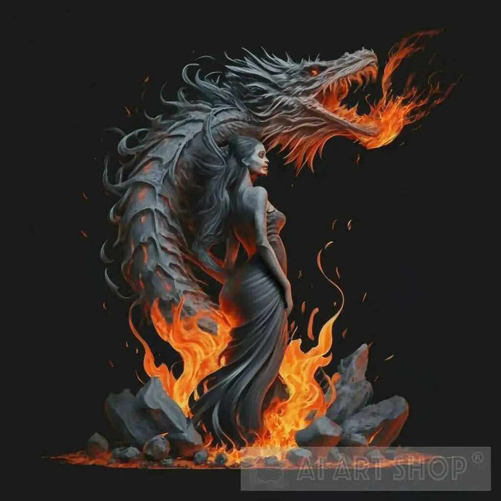 A minimalist art piece with a captivating woman with a giant ferocious fire breathing dragon in an enchanting silhouette and fiery cracks pattern on a gray background. Focus on clean lines and simple, elegant design. Burning coal and falling lava, conceptual art, drawing, cinematography, portrait photography v0.2