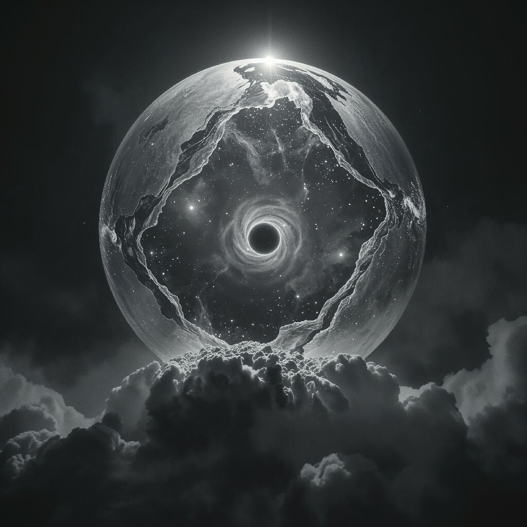 A translucent orb hovers above billowing clouds, its surface revealing a black hole's accretion disk encircled by continental forms. The sphere becomes a cosmic eye or portal, collapsing boundaries between planetary and stellar scales. Light crowns its apex while darkness pools within, creating visual tension between containment and infinity. This enclosed universe speaks to interconnectedness, suggesting that within every world exists another cosmos, and within every ending lies a gravitational pull toward new beginnings, an eternal cycle self-contained yet infinite.