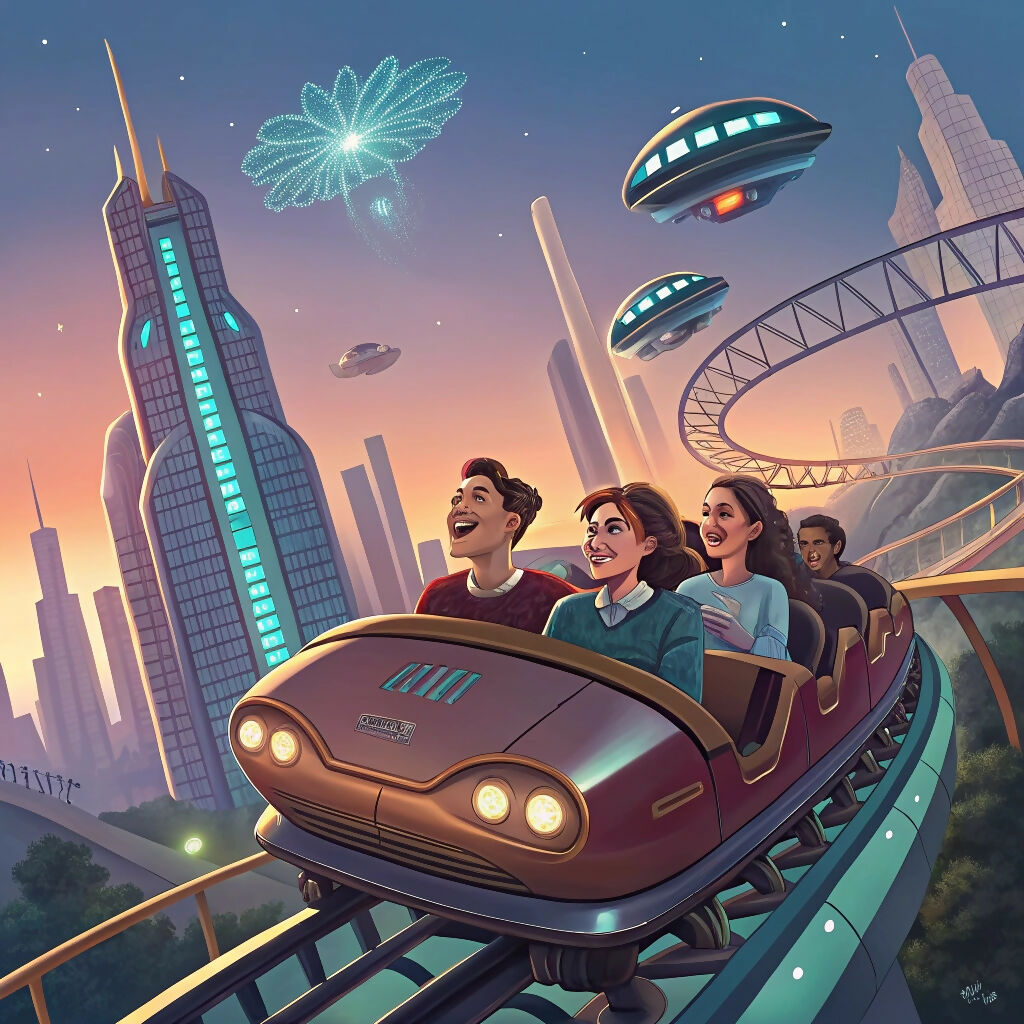 A vibrant celebration of exclusive, high-altitude leisure and boundless amusement. This exclusive artwork captures The Zenith Joyride, showcasing exhilarating speed and joy set against a backdrop of soaring future skyscrapers and high-tech transport. It is the ultimate acquisition for the discerning investor who defines luxury by peak experience, elite fun, and the ownership of futuristic play.