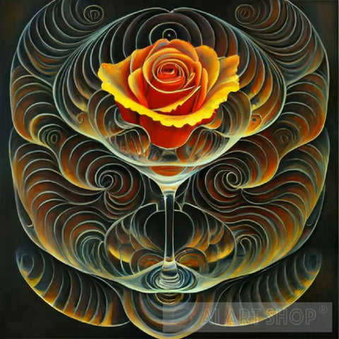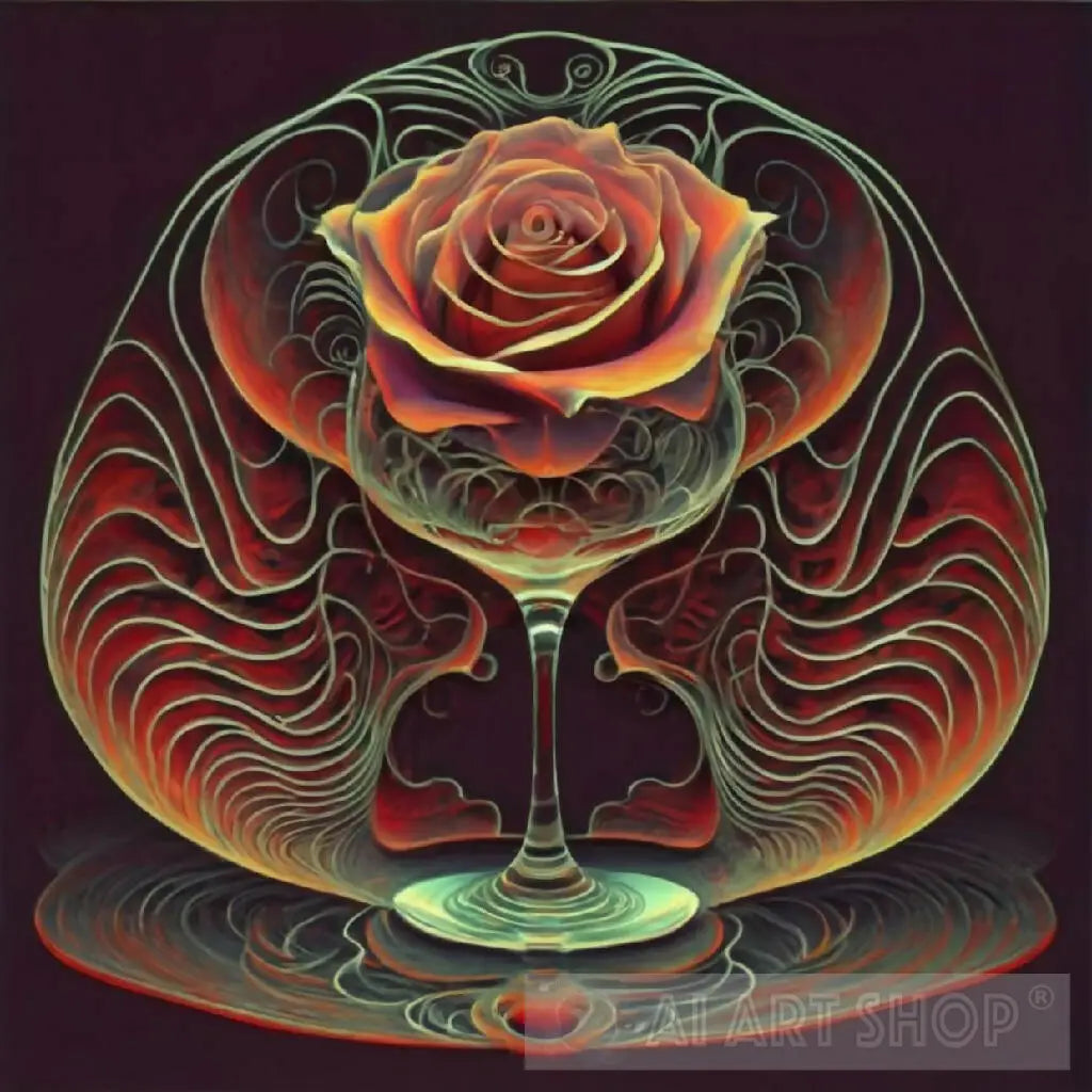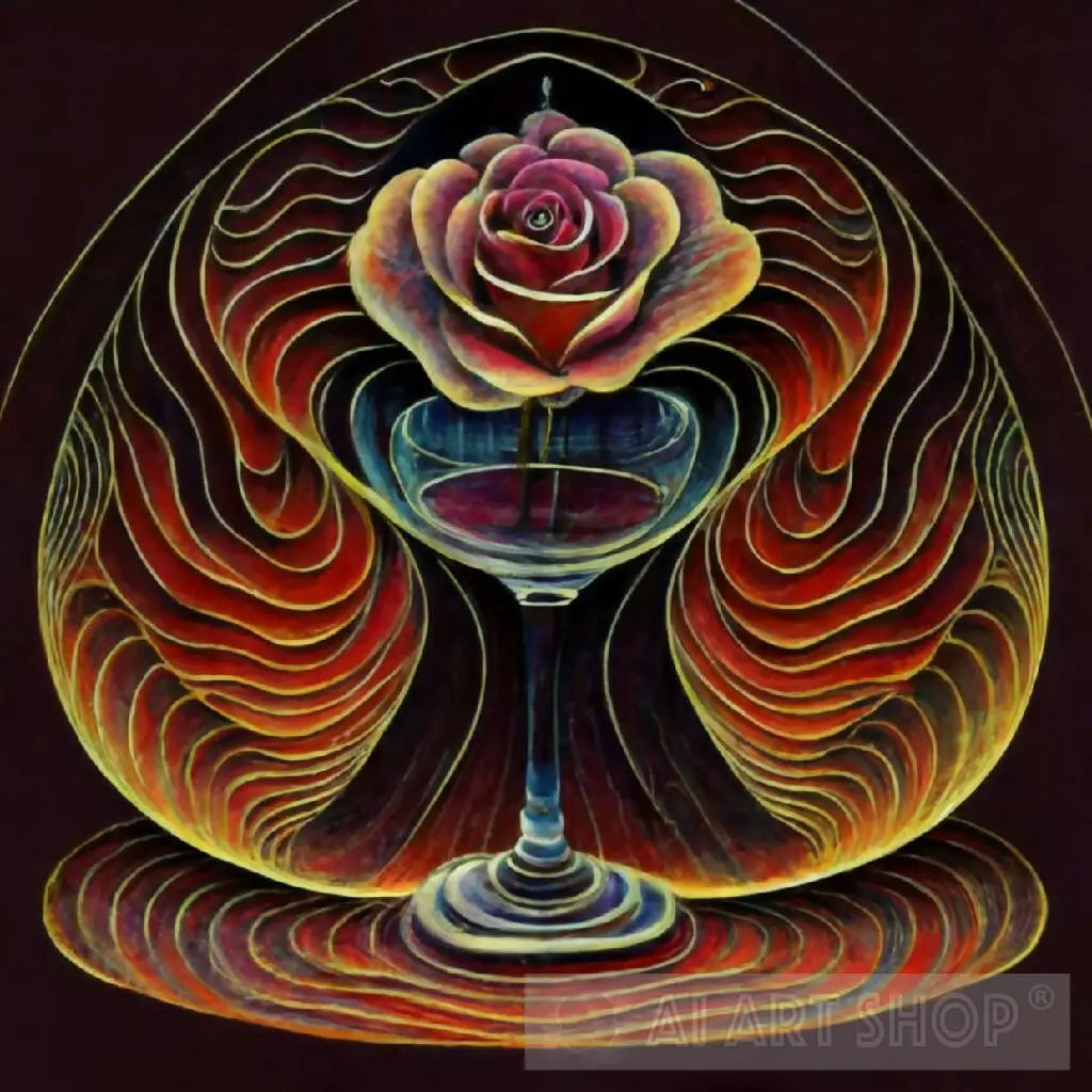 Thin lines in pen and ink, forming the circumference of a glass of water and a rose. All lines have the same mass. The lines show wavy movement.