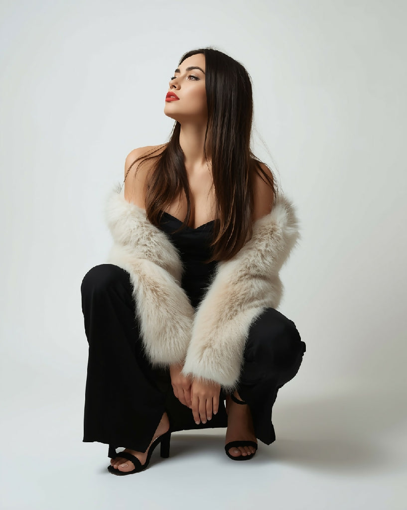 This image features a young woman posed in what appears to be a formal or glamorous setting, likely a studio given the plain, light background. Here's a breakdown of the key elements: Subject: The woman has long, dark, straight hair that cascades over her shoulders. Her makeup includes a bold lip color and defined eyebrows. She is looking up and to the side, creating a dramatic profile. Attire: She is wearing a long, black, strapless dress with a sweetheart neckline, suggesting a formal or evening event. She has draped a light-colored faux fur stole or jacket over her arms, which adds a luxurious and vintage-inspired touch. The fur is a mix of white, beige, and light brown. She is wearing black high-heeled sandals with ankle straps. Pose: The woman is posed in a low crouch or squat, which is an unconventional and dynamic choice for a formal photograph. This pose, combined with her gaze, gives the photo a dramatic, editorial feel. Aesthetics: The overall aesthetic is glamorous, dramatic, and a bit retro, possibly leaning towards a 90s supermodel or classic Hollywood vibe, amplified by the fur and the simple, high-contrast black and white attire.