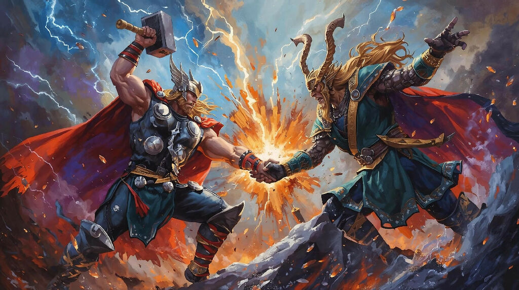 Vibrant painting depicting The God of Thunder Thor battling his evil nemesis Loki.