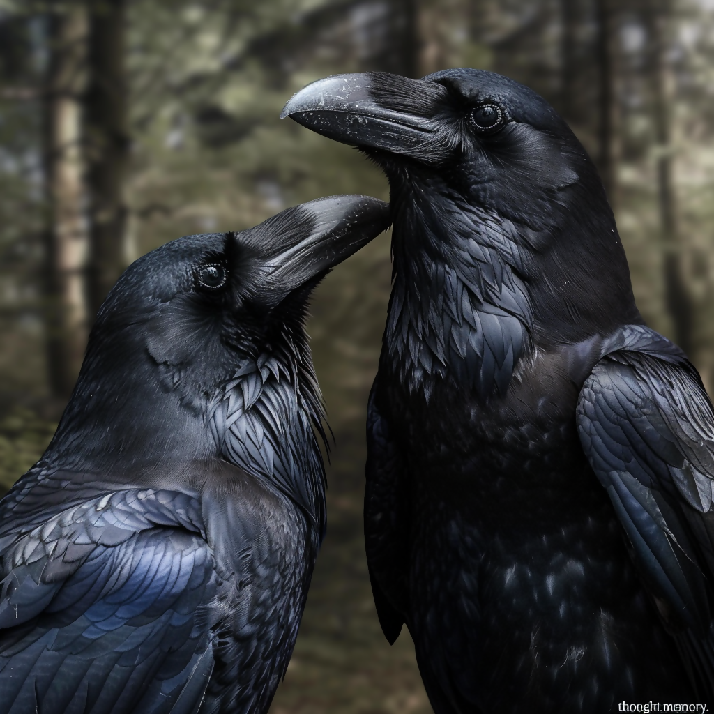 Tags: ravens, norse mythology, odin, thought, memory, fantasy art, digital illustration, symbolic animals, forest, mystical, atmospheric, black feathers, mythic birds, scandinavian lore, dark nature