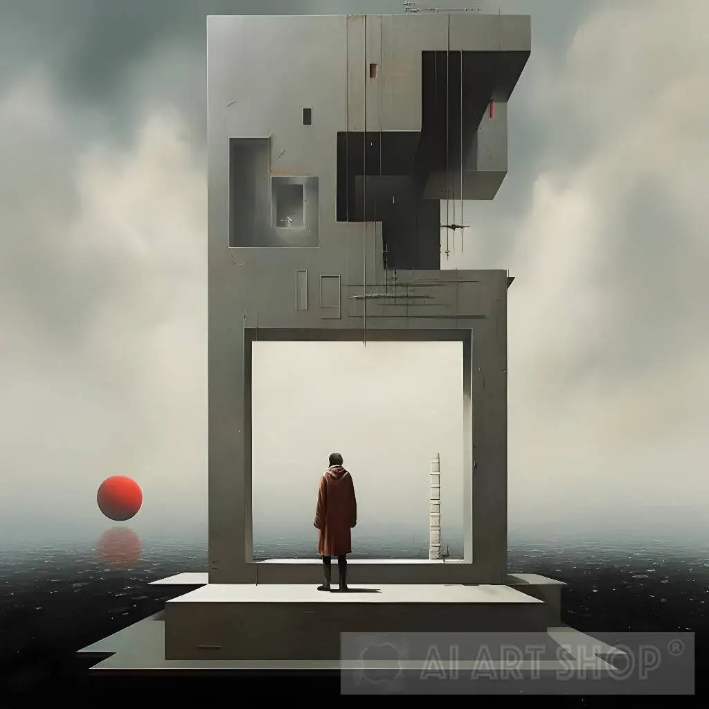 Immerse yourself in the Threshold of Aspirations, an artwork that eloquently captures the essence of human ambition and reflective thought. A figure, draped in the warmth of a terracotta cloak, stands before an open gateway, their gaze fixed upon a distant ladder and an orb of vibrant red.