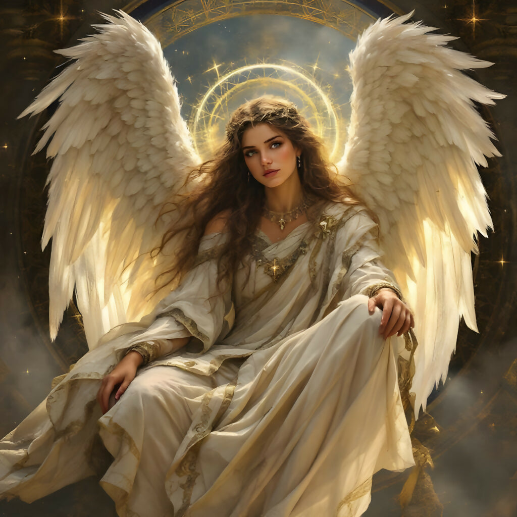 This majestic artwork captures a celestial angel seated in serene authority, surrounded by an aura of golden rings and heavenly light. Her flowing robes, adorned with ornate trim, echo the timeless grace of divine royalty. Her gaze is calm yet commanding, offering peace and protection to all who behold her.