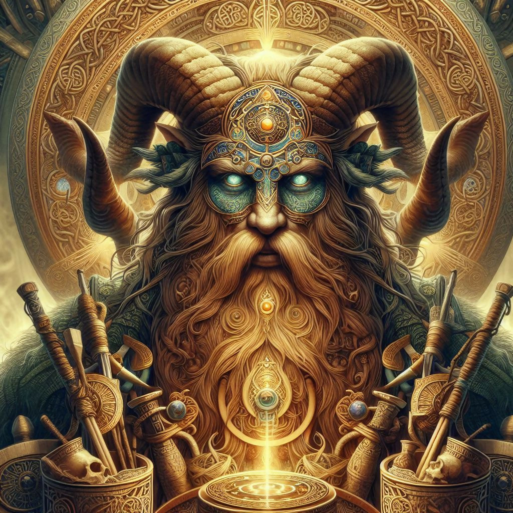 Tags: horned deity, fantasy throne, Celtic sigil, ancient weapons, mystical guardian, mythological art, warrior god, ornate armor, sacred geometry, dark fantasy.
