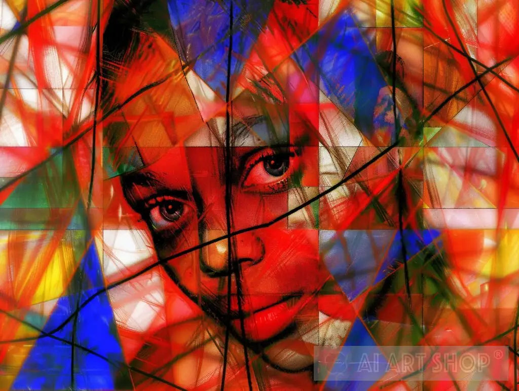 This captivating digital artwork combines the intensity of a human gaze with the dynamic energy of abstract patterns and vibrant colors. The central figure's face, rendered in a realistic style, peers through a kaleidoscope of intersecting lines and geometric shapes in bold reds, blues, greens, and yellows. The juxtaposition of realism and abstraction creates a sense of depth and complexity, drawing the viewer into the expressive eyes of the subject while exploring the chaos and beauty of the surrounding patterns