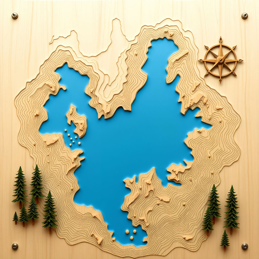 - Laser-cut layered wooden topography with bright blue lake and compass motif