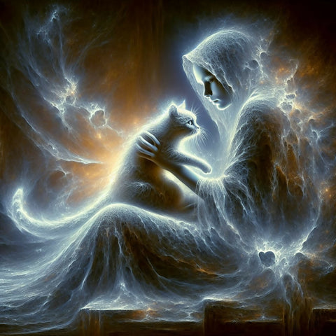 A beautiful depiction of a cat and his owner, both in spectral form, finally reunited together in the afterlife.