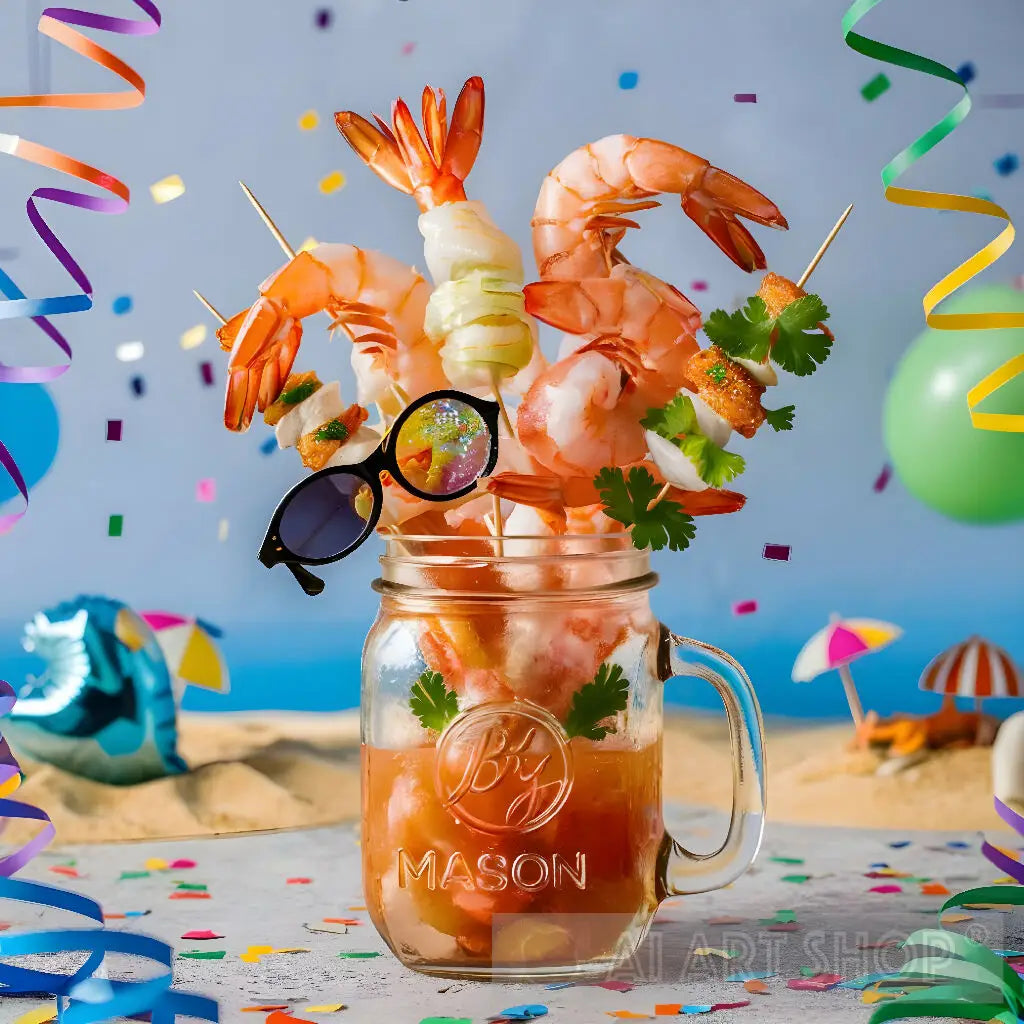 A joyful and festive photo for National Shrimp Day, featuring a transparent glass mason jar brimming with colorful, cooked shrimp. The shrimp are arranged artistically, some standing upright with fanned-out tails, others scattered playfully. There's a variety of colors, including peeled shrimp with cocktail sauce, skewered shrimp with vibrant herbs like cilantro and parsley, and a few dusted with edible glitter for a touch of sparkle. The background is a lively and celebratory scene, with confetti scattered everywhere and colorful streamers framing the shot. Adding to the fun atmosphere are balloons shaped like sea creatures, a miniature beach scene with sand and tiny umbrellas. A pair of sunglasses are perched on the rim of the jar, as if ready for a "sh