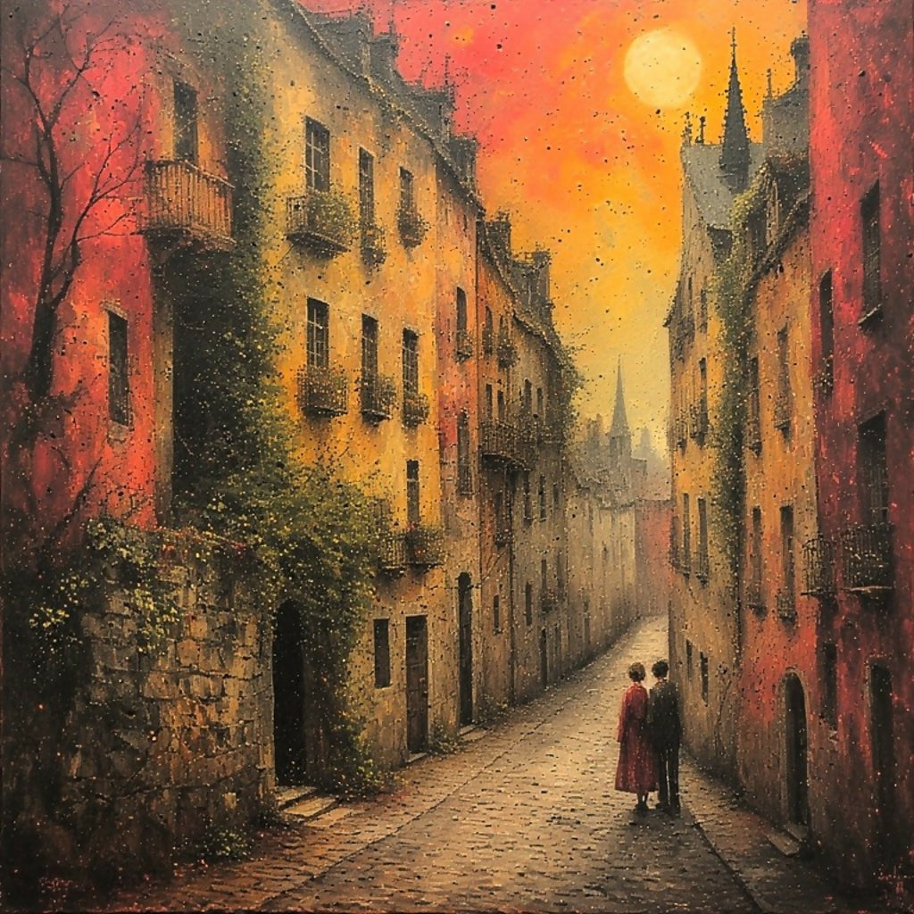 Imagine a scene steeped in old-world charm and romance. A couple stands on a beautifully worn cobblestone street, the kind that whispers tales of centuries past. They are enveloped by the quietness of the town , with towering, ancient buildings flanking them on both sides.