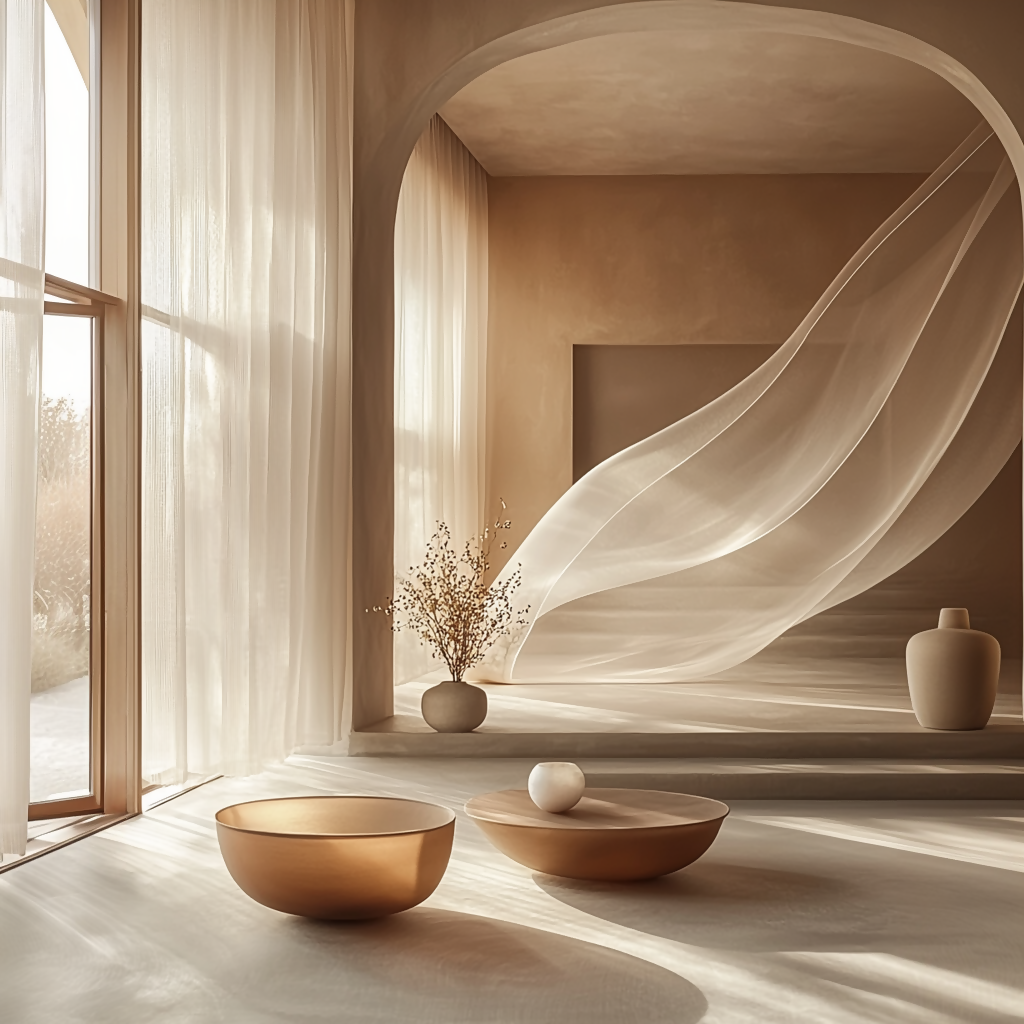 Imagine walking into your favorite luxury spa retreat...that moment when your shoulders drop, your breathing deepens, and the world's chaos simply melts away. This serene interior art bottles that exact feeling, featuring gossamer sheer curtains that dance with golden sunlight, handcrafted ceramic vessels that speak of ancient traditions, and warm beige walls that embrace you like a gentle hug.