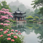 This image depicts a serene and picturesque Garden. In the center, a traditional pavilion with a curved roof stands reflected in the still waters of a pond, surrounded by lush greenery and vibrant pink cherry blossoms. The scene is shrouded in a light mist, creating a dreamlike and atmospheric ambiance. The pavilion's intricate architectural design and the harmonious arrangement of the landscape elements suggest a carefully curated and well-maintained garden.