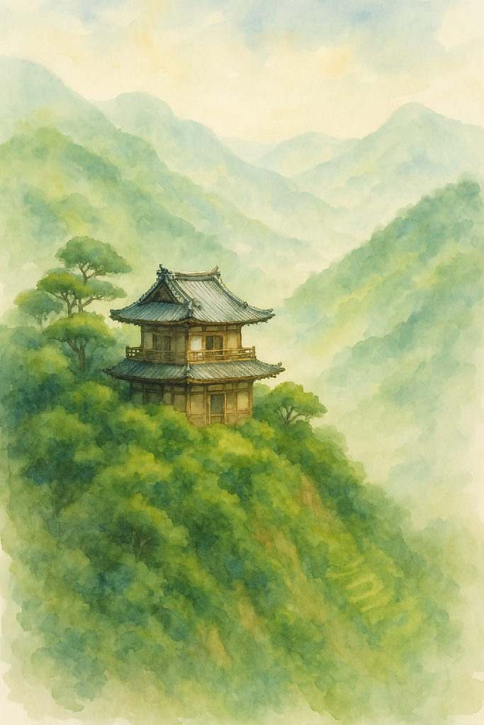 This serene watercolor painting captures a traditional Japanese house nestled atop a lush, green mountain. Surrounded by soft mist and layered forested peaks, the two-story wooden home blends harmoniously with nature. The artwork radiates peace and solitude, using delicate washes of color, subtle light, and atmospheric perspective to evoke timeless beauty and stillness.