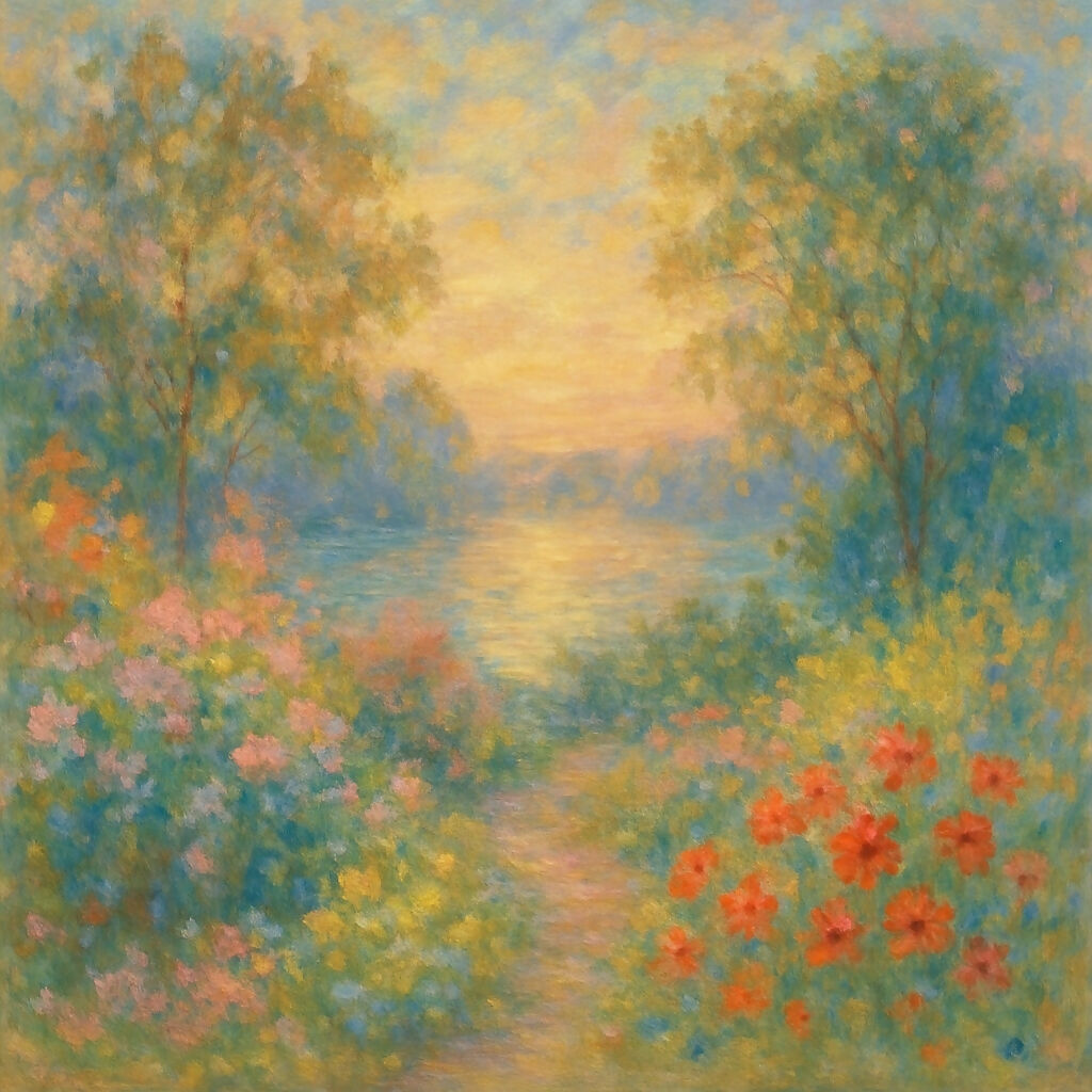 Bring the serenity of nature into your home with our Tranquil Landscape Canvas Art. This stunning piece features a peaceful water scene framed by two majestic trees, creating a natural pathway that draws the viewer's eye to the shimmering water in the background. The vibrant floral arrangements, with soft pink and yellow blooms on the left and bold red flowers on the right, enhance the tranquil atmosphere. The impressionistic style and gentle pastel colors evoke a sense of calm, making it perfect for any room where relaxation is key.