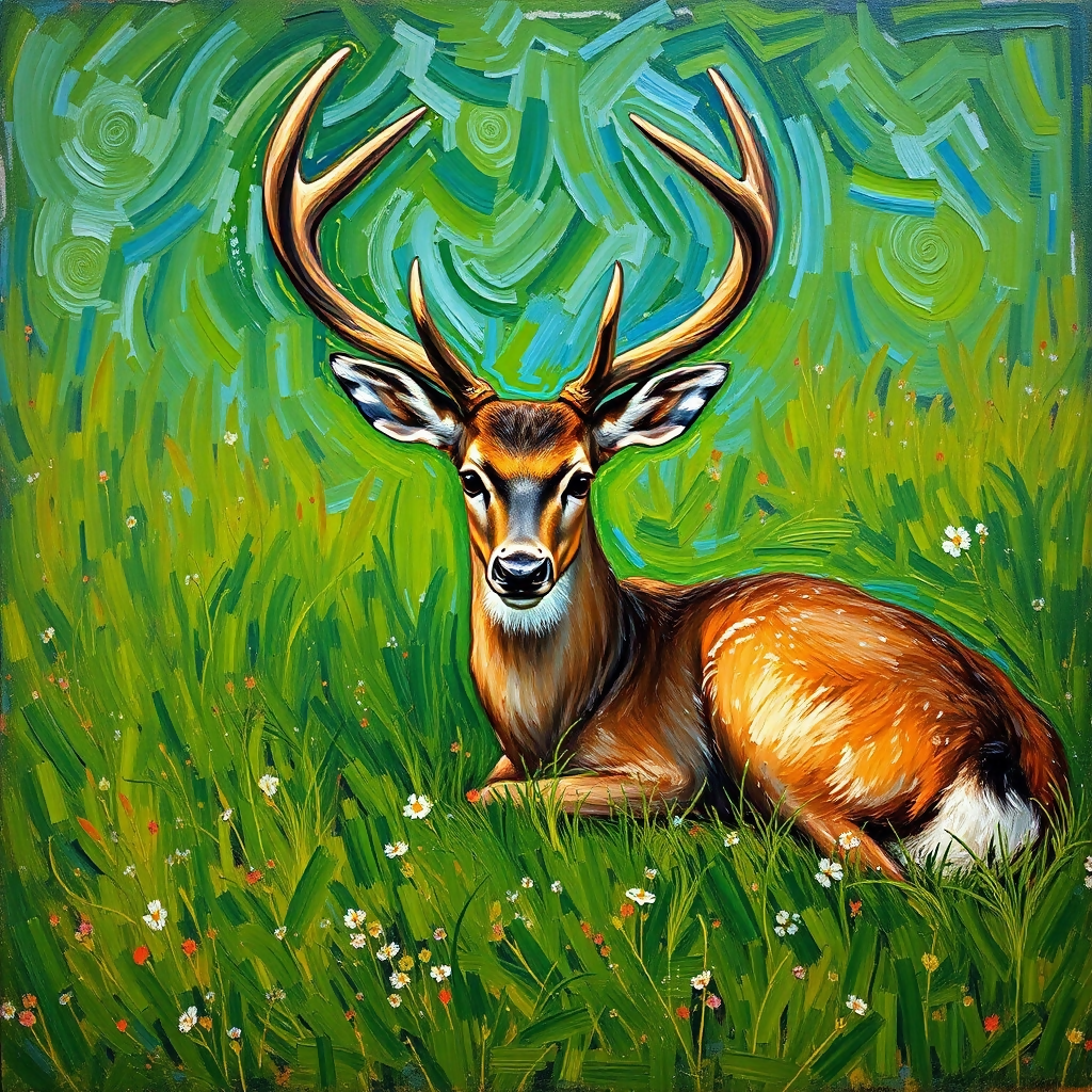 This serene image captures a fallow deer with elegant antlers resting peacefully in a lush green meadow. Bathed in soft natural light, the deer’s graceful form blends harmoniously with the vibrant surroundings, evoking a sense of calm and connection to nature. The intricate details of its antlers contrast beautifully with the gentle curves of its body, while the verdant meadow frames the scene, creating a timeless portrait of quiet elegance and tranquility.