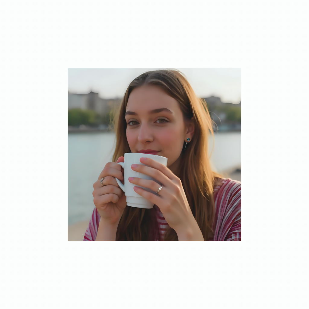 A peaceful 8K cinematic photograph showing a young woman with smooth facial symmetry and precise finger structure, savoring coffee beside a quiet river. Captured professionally with Canon EOS R5 in soft natural sunlight, this image embodies tranquility, elegance, and photorealistic quality for premium art prints.