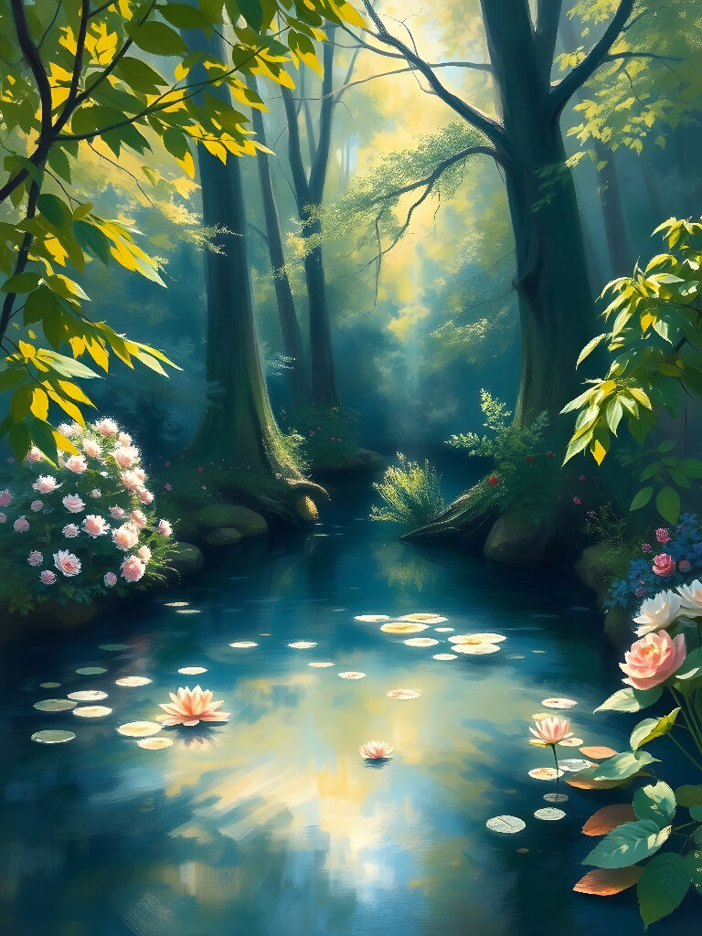 Sunlight filters through the lush canopy of a serene forest, dappling the calm surface of a pond dotted with delicate water lilies. Pink and white blossoms frame the water's edge, reflecting softly in the tranquil depths. The air feels still and peaceful, inviting contemplation and a connection with nature's quiet beauty.
