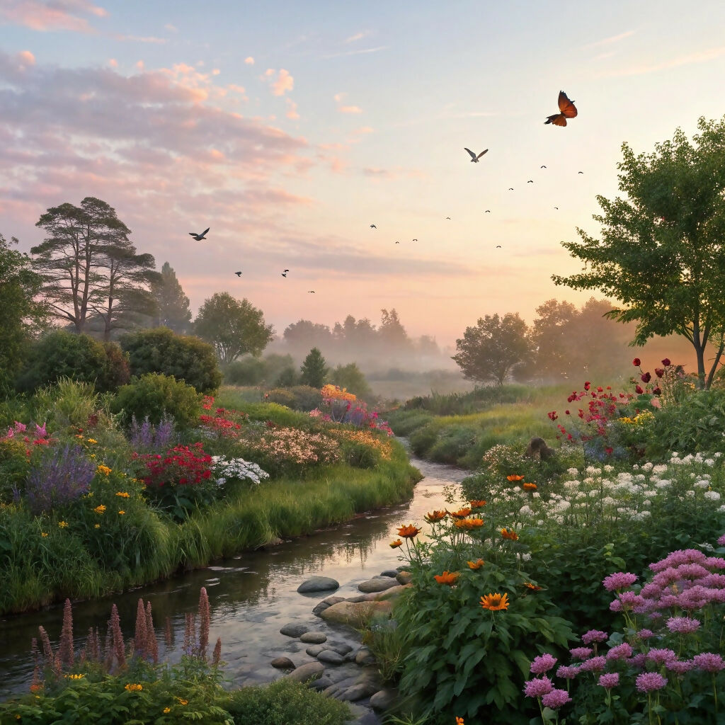 A small, clear stream flows through a vibrant garden. The stream bed is lined with smooth, grey stones.