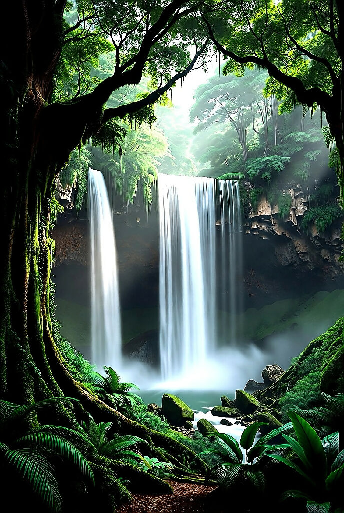 an ai painting of  lush forest stretching endlessly, towering ancient trees whose canopies intertwine to form a dense, green ceiling. In the distance, majestic waterfalls cascade down rugged cliffs, their waters shimmering as they plunge into hidden pools below. A gentle mist weaves through the forest floor and rises from the waterfalls, creating an ethereal, mystical atmosphere. The scene exudes tranquility and mystery, inviting exploration into the lush, untouched wilderness
