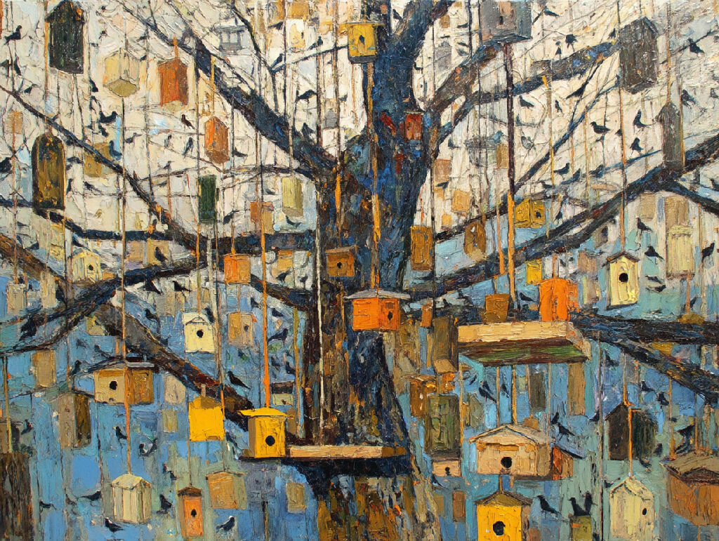 The painting depicts a tree laden with birdhouses of varying shapes, sizes, and colors, creating a rich and whimsical scene. The branches stretch outward, forming a dense network from which the birdhouses hang, resembling lanterns or ornaments. The muted backdrop of blues and grays contributes to an atmospheric quality, while deeper shades of brown and green on the tree create a sense of structure and depth. The strokes are bold and textured, giving the painting an expressive, tactile feel. Small birds are perched throughout the scene, adding life and movement amid the geometric forms of the birdhouses. Overall, the painting evokes themes of shelter, community, and vibrancy within a natural setting.