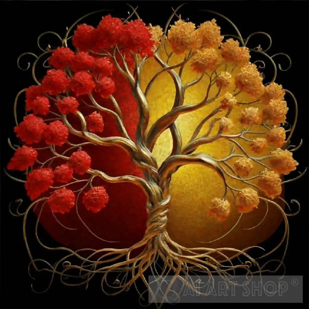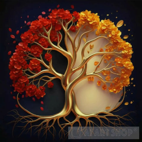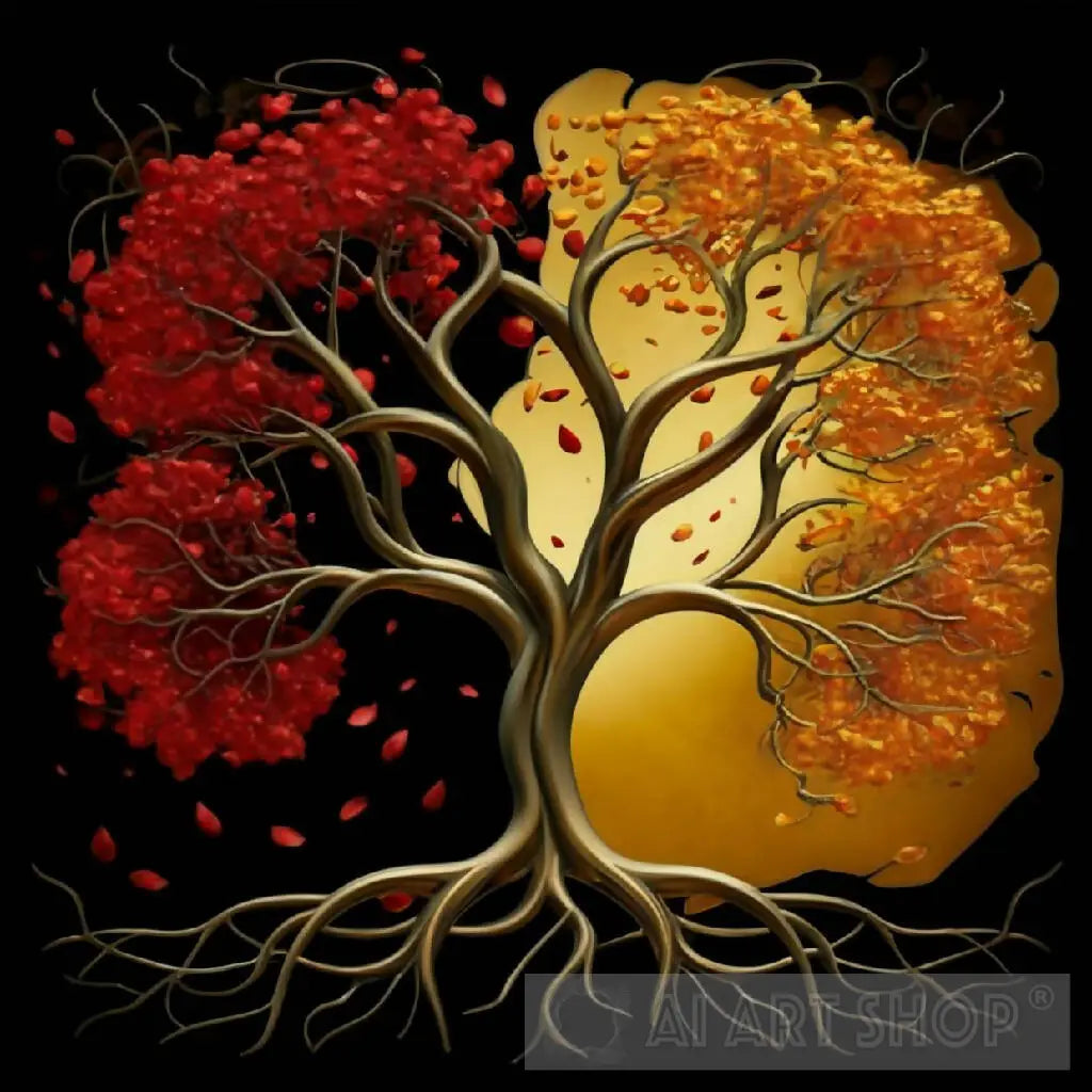 Tree with golden leaves and twisted and intertwined branches oil painting