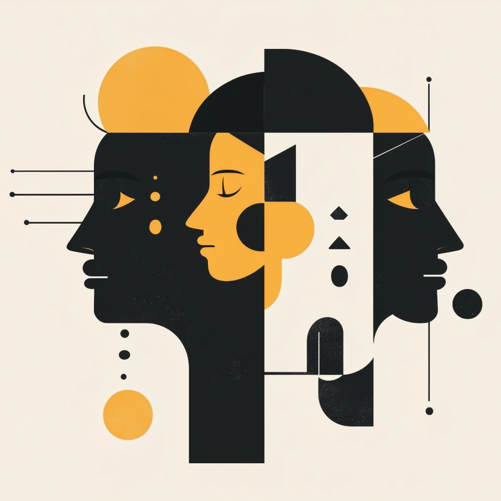 This high-resolution AI artwork portrays three interconnected profiles, linked through vibrant geometric elements and golden highlights. A sophisticated meditation on communication, shared dreams, and the invisible energy flowing between us.