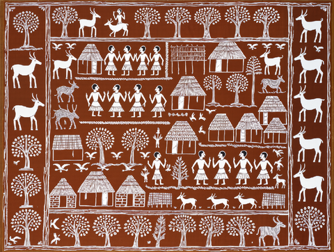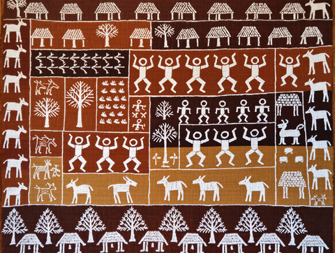 This stunning textile captures the spirit of Warli art, with crisp white tribal illustrations narrating a seamless flow of daily village activities. Set on warm, organic brown cotton, it radiates cultural depth and hand-crafted detail perfect for decor or fashion.